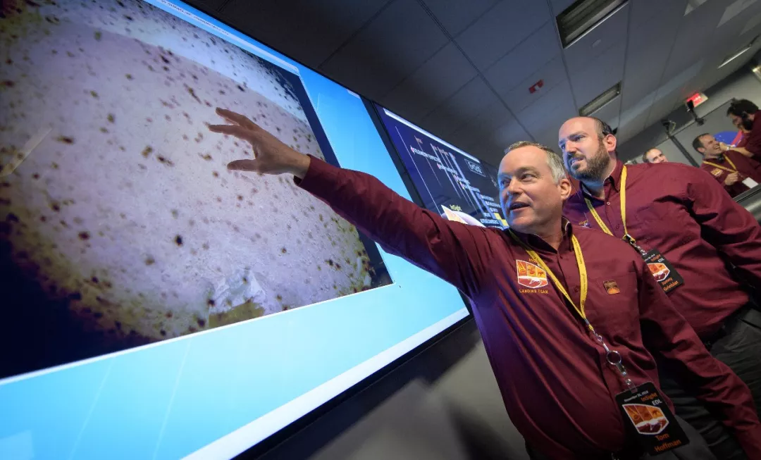 洞察号传回的首张火星表面图,图中伸手的是洞察号项目经理Tom Hoffman。 来源:NASA/Bill Ingalls