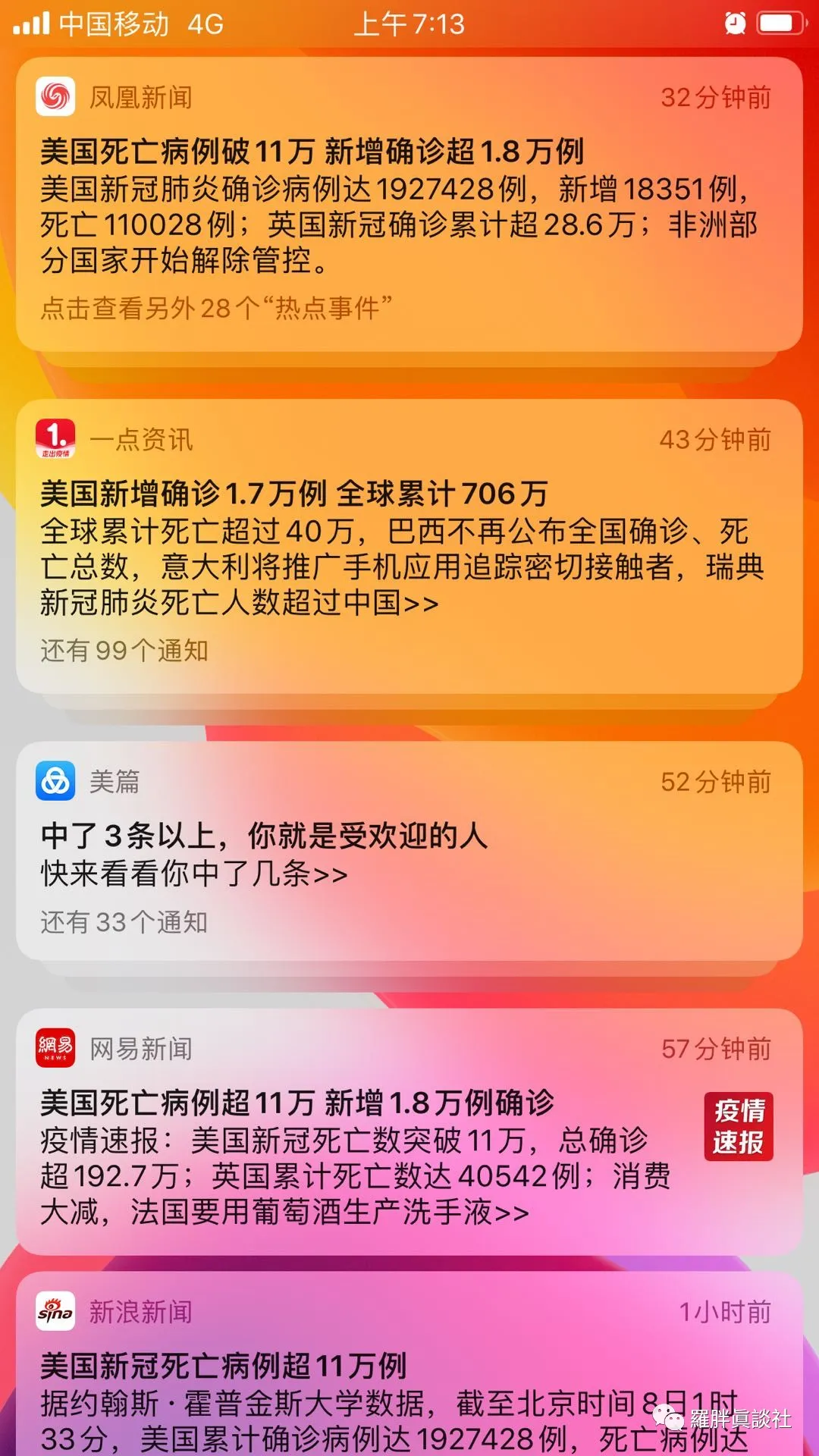 昨天上午7点13分,新浪、网易、凤凰、一点资讯等门户网站平台,几乎同一时间推送了美国死亡11万人的新闻。还有其他很多媒体机构,都无一例外、无差别地争相报道这则美国新闻。
