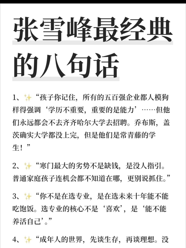 看過張雪峰跟家長講話的切片,他的口氣像是跟他看不起的鄉下人在說話,擠眉弄眼 搖頭晃腦,讓我開了眼界,完全不像教育圏的,反倒像黑社會