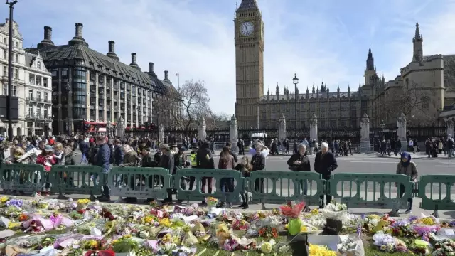 伦敦议会广场外摆放的鲜花和前来悼念恐怖袭击遇难者的民众 (Picture: AP)