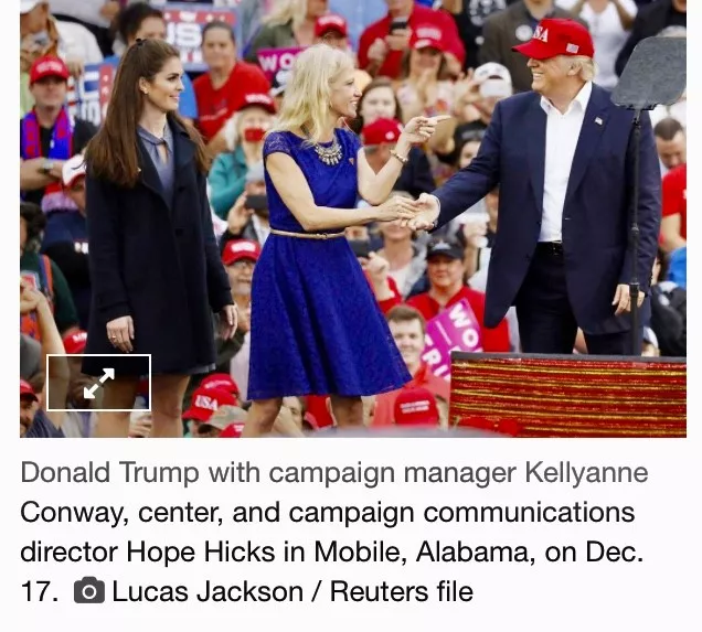 被视为女性“公敌”的美国总统川普,其手下有几位能力超常的女性。笔者最感兴趣的两位是:总统顾问凯莉安娜·康维(Kellyanne Conway),白宫通讯主管霍普·希克斯(Hope Charlotte Hicks)。