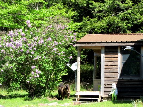 路上到处是紫丁香花丛, 很多人家都有一到几棵丁香树。湖边的主人家有个藏獒,主人