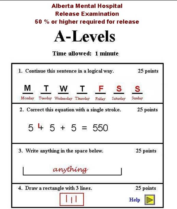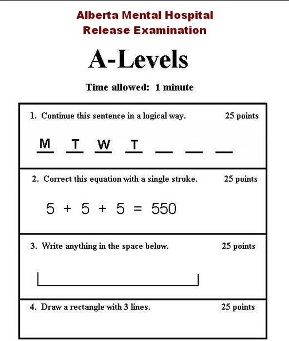 在加拿大的艾伯塔省,阿尔伯塔精神病院,患者必须通过一个简单的检查,以符合出院的条件。