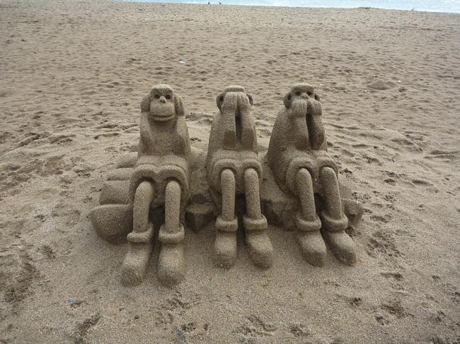 这是在巴塞罗那沙滩上的沙雕: 3个聪明猴子