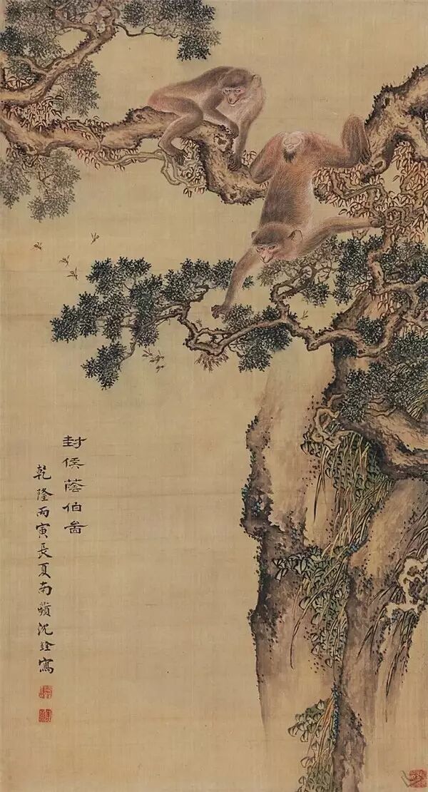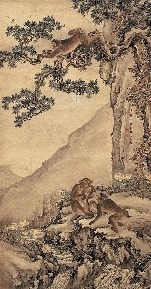 中国人画猴子的历史最早可以追溯到宋代。在事事追求吉祥的中国文人笔墨中,因为“猴”与“侯”同音,所以古代画手有把猴子与蜜蜂和马画在一起,取“马上封侯”之谐音与吉意。