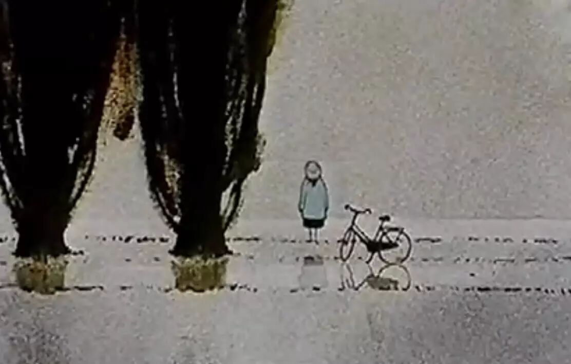 爸爸放下女儿,自己划着船远去了,直到天黑也没回来。小女孩等了又等,最终骑着自行车回家了。