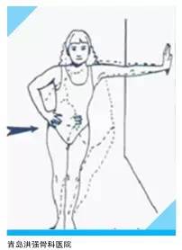 腰椎间盘突出症保健操图解(下) 靠墙牵伸 一侧上肢支撑墙面,另侧上肢辅助髋关节缓慢下墙面活动
