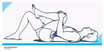 单膝牵伸 牵拉一侧膝关节直至感觉到下腰部及臀部适度的牵伸,另侧膝关节重复相同动作