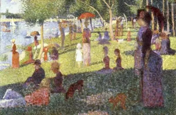 点彩画派源于法国, 是从印象派的光与色彩的 原理发展而来。代表作正是 上面这幅《大碗岛上的星期天》。