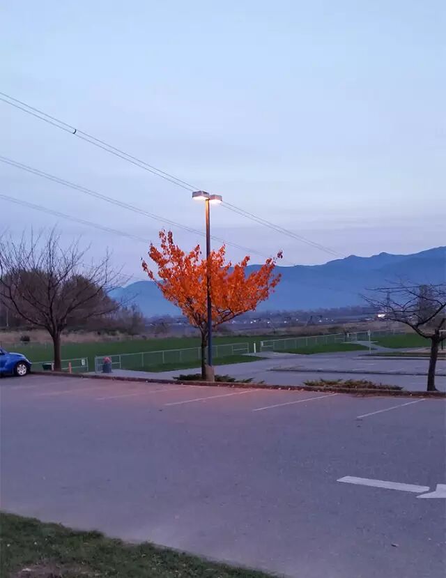 当周遭的树木都暗淡无色时,这棵树因为有了灯光照射,叶子生长得灿烂夺目。