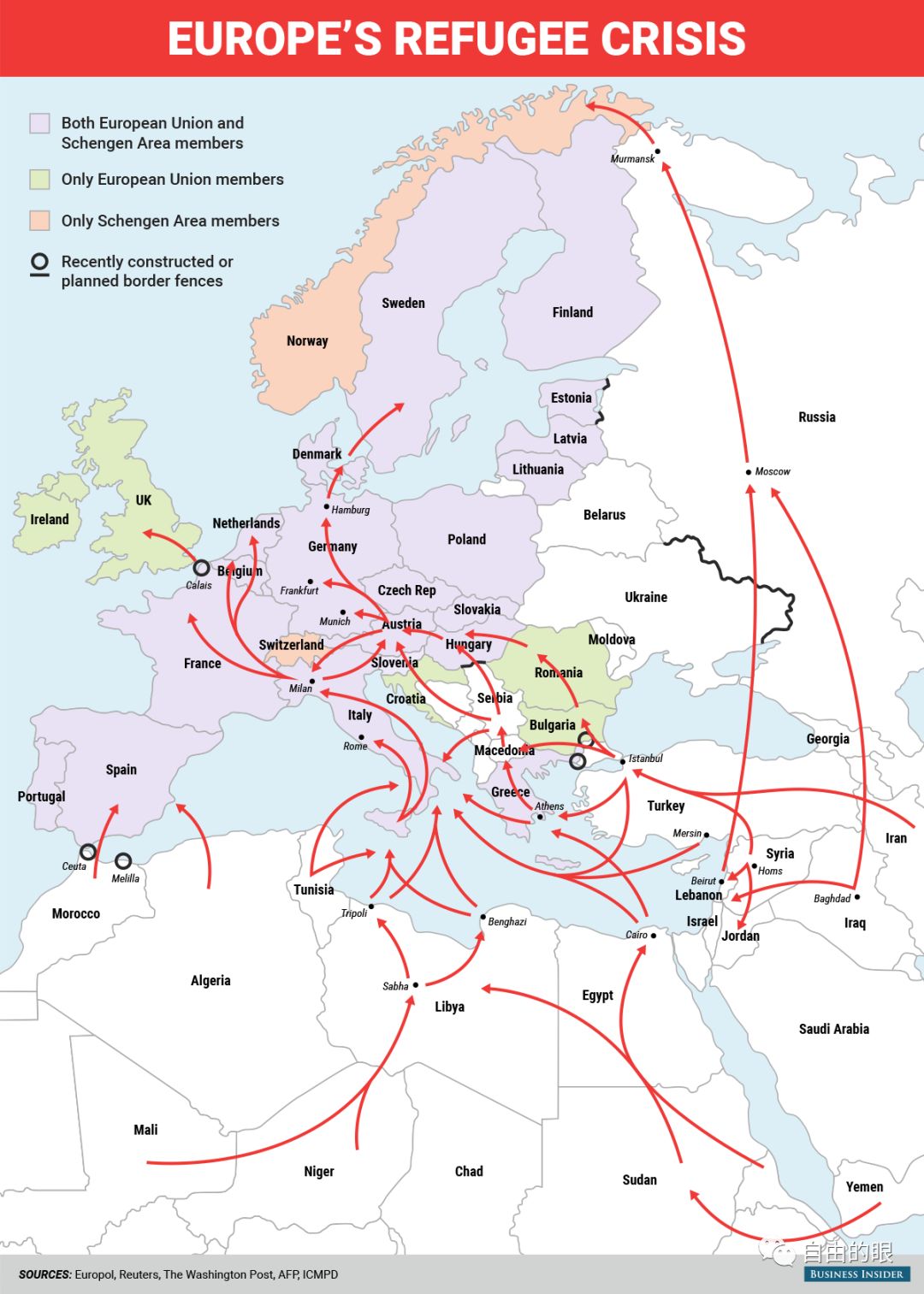 第六个理由:德国的政治抱负及国家形象 德国对自身政治地位的探求一直周折不断,经由一二战的挫败无奈长时间被迫龟缩于经济领域,但它始终诚恳承担纳粹历史责任,谋求世界对其的重新认可。后冷战格局中,凭借美国的马歇尔计划起死回生,与法国连成盟友代表欧洲与美国进行政治对话。直至两德统一后,德国在地区和国际事务上开始彰显更多的政治抱负,欧盟的推动,俄乌冲突,欧债危机等重大国际事件中,德国隐隐以欧洲领导者的身份出面协调斡旋。 一切顺风顺水之际突如而来的难民危机几乎冲垮了德国费心推动的欧盟一体化,除却英国脱欧,东欧波兰匈牙利对待难民问题时表现出桀骜态度,长期基友奥地利也始终呈摇摆姿态,甚至部分申根区欲暂停申根条约以防止恐怖分子自由流窜,威胁国家安全,这些现实令邻国全是申根区成员国的欧洲最大经济体德国急需慎重思索对策,以身作则接纳聚集于意大利与希腊的大批难民,以维护欧盟从司法,经济,政治及价值观上的统一稳定。