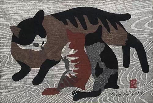 日本版画家斋腾清画猫,意在表达哺乳中的母子亲情。