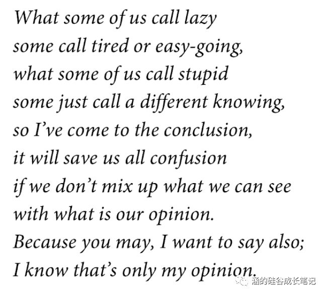 我们说有的人懒惰 另一些人说他们与世无争 我们说有的人愚蠢 另一些人说他学习的方法有区别 因此我得出结论 如果不把事实和意见混为一谈 我们将不再困惑 因为你可能无所谓 我也想说 这只是我的意见