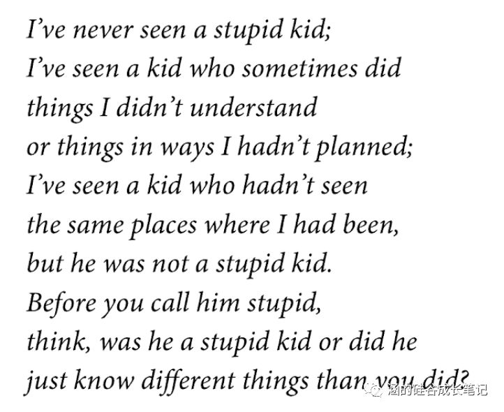 我从未见过愚蠢的孩子 我见过有个孩子 有时做的事我不理解 或不按我的吩咐做事情 但他不是个愚蠢的孩子 请在你说我愚蠢之前 想一想他是个愚蠢的孩子 还是他懂的事情 与你不一样