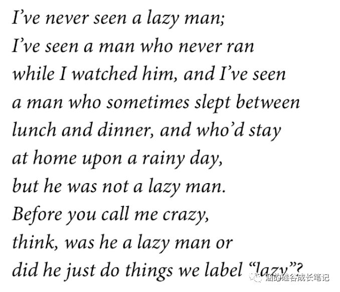 我从未见过懒惰的人 我见过有个人 有时在下午睡觉 在雨天不出门 但他不是个懒惰的人 请在说我胡言乱语之前 想一想他是个懒惰的人 还是他的行为 被我们称为懒惰
