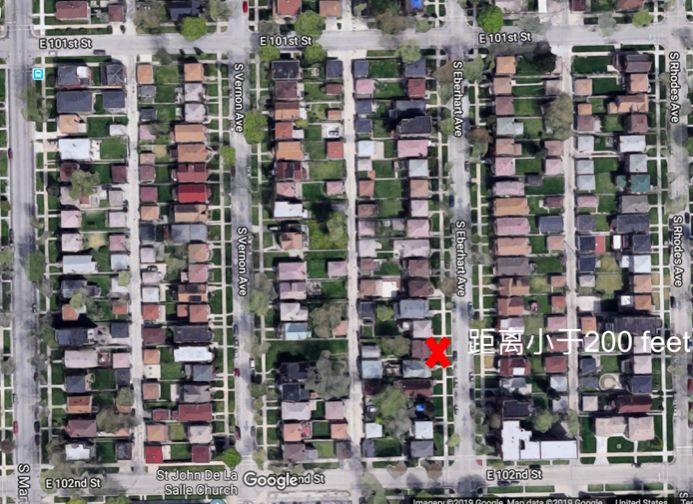 就这样在一片破败的小区中兜了一段时间以后,终于在S Eberhart Ave在101st St和102nd St之间某个位置直接距离显示为200英尺,说明离目标已经很近了。