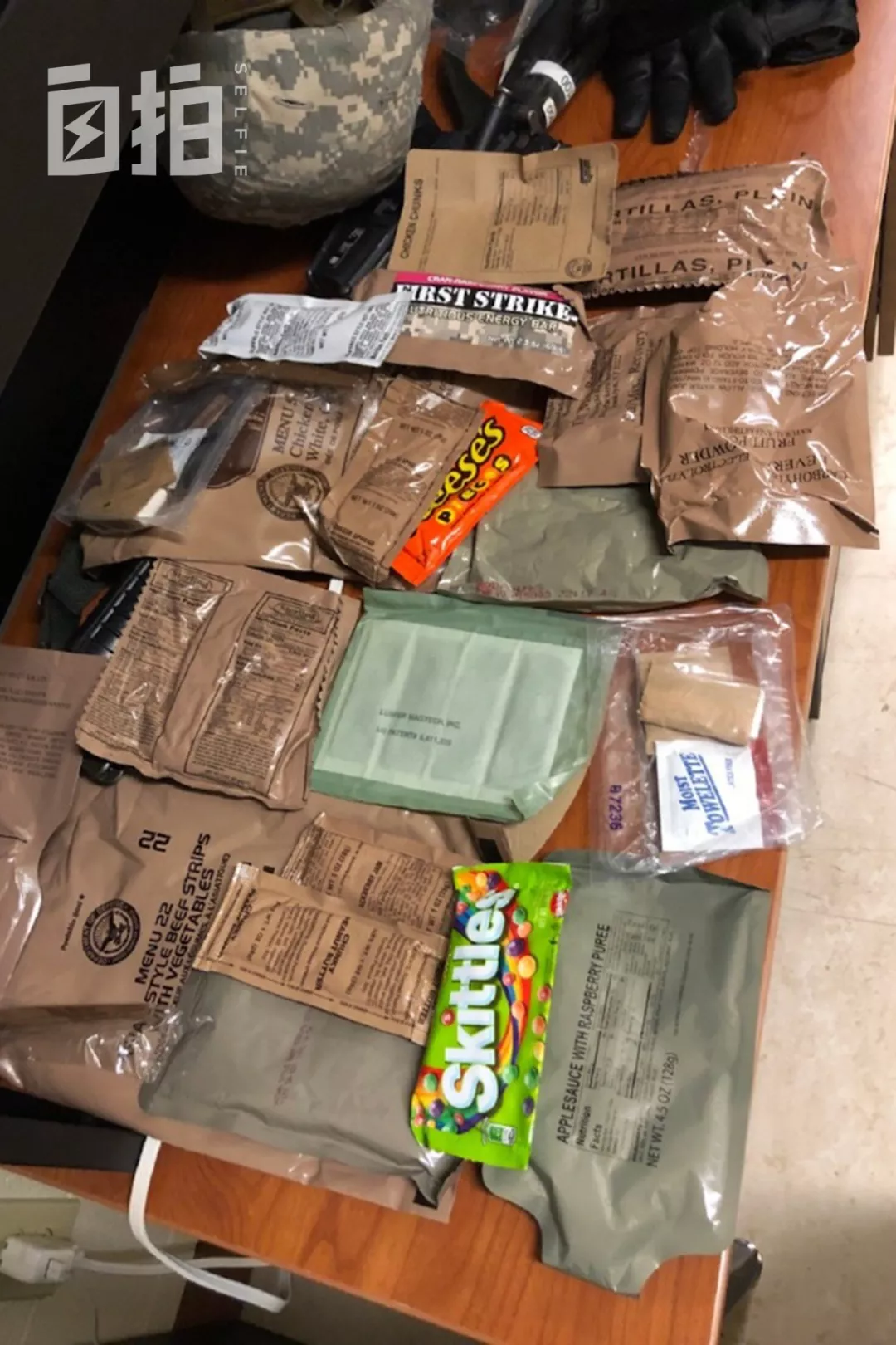 这两包“MRE口粮”,就是我第一天在野外的早饭和午饭。 这种美国陆军的野战方便食品,最早由于太难吃,曾被吐槽为“敌人也拒绝的食品”。现在口味已经有了改良,不过就是太容易长胖了。比如味道不错的“亚洲炖牛肉”菜单,除了牛肉,还有面包、彩虹糖、花生酱、黑莓酱、巧克力奶。