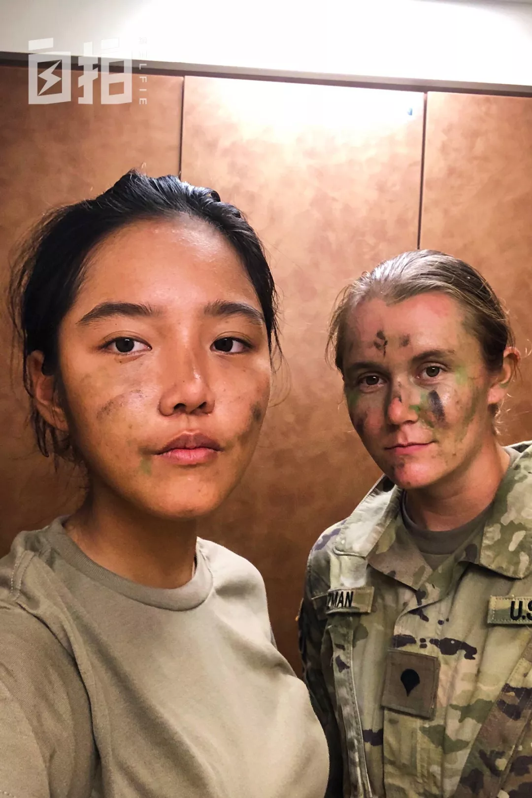 基础训练营的生活是规矩最多的。为了培养集体观念和纪律性,宿舍是四、五十人一间,而且还要没收手机,每天几乎只有洗澡后的时间是自由的。等到基础训练结束时,我终于有机会拿回手机自拍。 我一直以为自己已经够黑了,但没想到,比起训练前还是黑得这么明显。