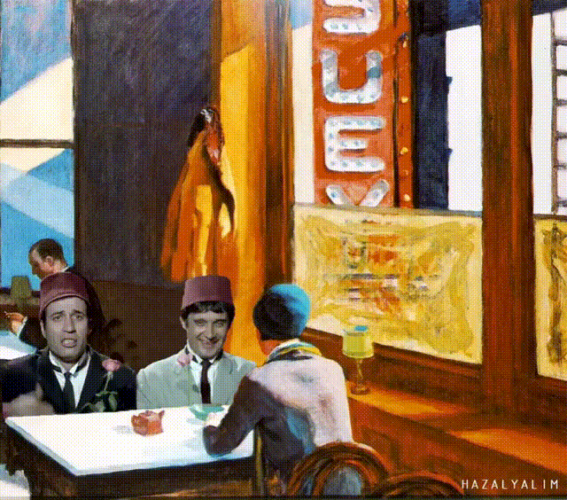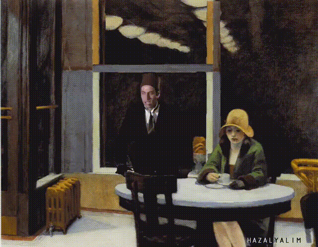 他不但把電影人物PS進畫裡,同時還都以動態的方式來展現,以另一種方式賦予了那些沉悶的作品生氣,拉進了它們和時代的距離。 愛德華·霍普《Chop S》 ▽