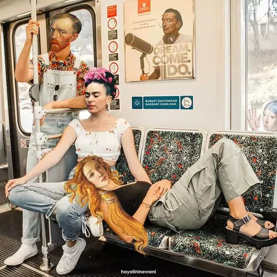除了這對CP,還有很多名畫裡的人物被他搬進了現實生活中,一起坐地鐵 ▽