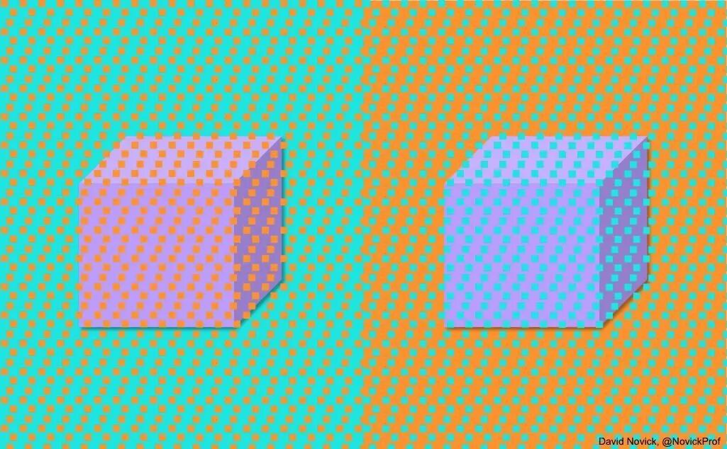 这个错觉是因为,大脑在判断物体原本的颜色时,会忍不住把周围的颜色带进去“综合考量”。