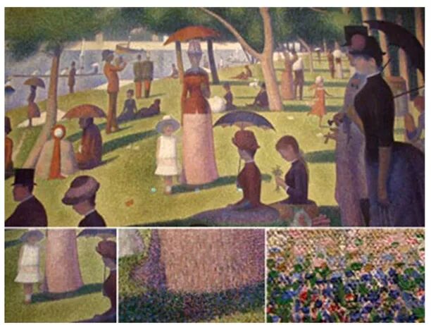 比如点彩画(pointillism)大师乔治·修拉(Georges Seurat)就擅长绘出一个个彩点,然后让观众的眼睛自己组合出“别的颜色”。修拉的油画《大碗岛星期天的下午》,完全就是一幅充满视错觉的名作。