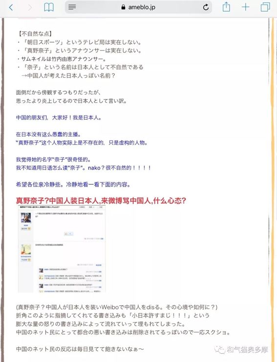 2012年的谣言“朝日体育主播真野奈子辱华发言”传到日本后,日本网友的反应:“真野奈子?中国人装成日本人,来微博骂中国人。这是什么心态?好不容易有这样指出谬误的发言,也很快就被大量的“小日本不可原谅!”的回帖冲走淹没。对中国网民不利的发言是很快就会被删除的,所以我截屏了。每天看着中国网民的反应,真是看不厌呐。”