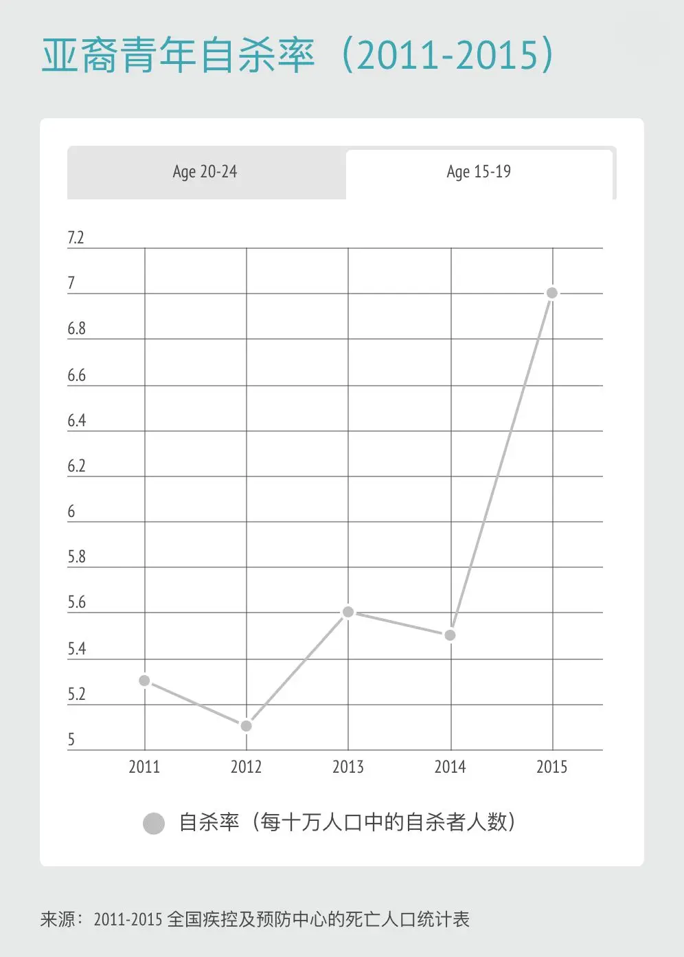 2015年,20至24岁亚裔美国人死亡事件当中,自杀是主要原因,占该年龄组死亡人数的三分之一,(这一比例)在所有种族中最高。社会科学专家和教育家把这个惊人数字归咎于文化污名和社会压力,始于家庭,分布于整个社会。