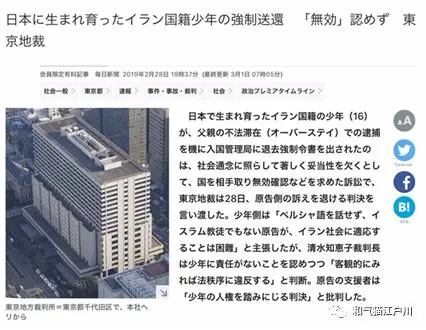 ▲2019年2月28日每日新闻报道,东京地方法院判决,出生在日本的16岁少年与父亲一起被遣送回伊朗。 出生在日本的伊朗国籍的16岁少年因父亲非法滞留被强制遣送回国,该少年也同样被决定遣送回国。 该少年在东京地方法院提起诉讼称,自己出生在日本,不会说波斯语,适应伊朗社会有困难。清水知惠子审判长认为,虽然少年主观上自己是没有责任的,但客观上违反法律秩序,判决支持入国管理局把这对父子强制遣送回国。 https://mainichi.jp/articles/20190228/k00/00m/040/194000c