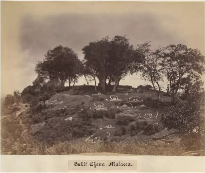 大家看一下,这里有果阿的鱼咖喱、酸辣猪肉。这个酸辣猪肉大家不要看它这个颜色,其实是非常辣的。 还有咖喱蟹这些食物都慢慢地出现了。当然在有辣椒之前,咖喱本身也是有辣味的,因为有姜来作为它辣味的来源。有了辣椒之后,咖喱里面的辣味就更加强烈了。葡萄牙人到了果阿之后,并没有就此止步,而是继续向东拓展殖民地。他们到了哪里呢?到了马六甲,就是在建立果阿殖民地的第二年,Albuquerque就率领舰队攻下了马六甲。葡萄牙人当时是跟马六甲苏丹国交战,然后强攻下了马六甲。因为马六甲是一个中国人长期聚居的地方。为什么这么说呢?我们不要以为中国人的活动范围就仅限于中国,实际上中国人是长期都在东南亚经营和活动的。尤其是明朝和清朝的时候,东南亚华人的活动非常地频繁,马六甲是一个很重要的华人定居点和商业贸易节点。大家会觉得奇怪,当时中国是实施海禁政策的,为什么在有海禁政策的情况下还有这么多华人来从事商业活动?还能够跑到国外去?其实,正是因为海禁政策,导致当时的商人不能频繁地登陆中国领土,所以他们不得不在中国以外寻找一些贸易据点,当时马六甲就是这样一个很重要的贸易节点。除了马六甲以外,华人人数过千的还有其他几个地方,比如说苏门答腊岛的巨港也是华人的一个很重要的据点,还有吕宋岛上也有一些华人据点。这个地方叫做Bukit Chena Malacca,就是三宝山。  ▲ 马六甲三宝山,1860年拍摄