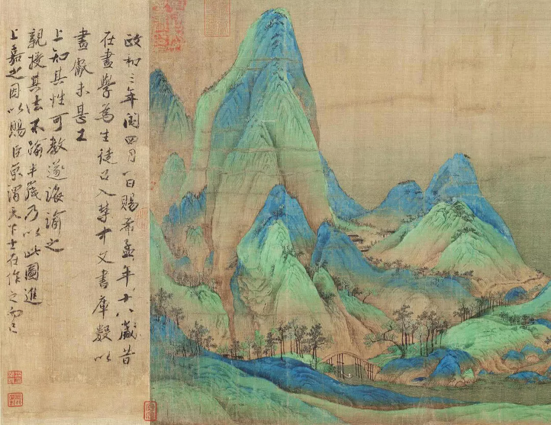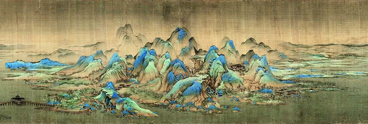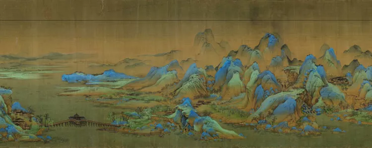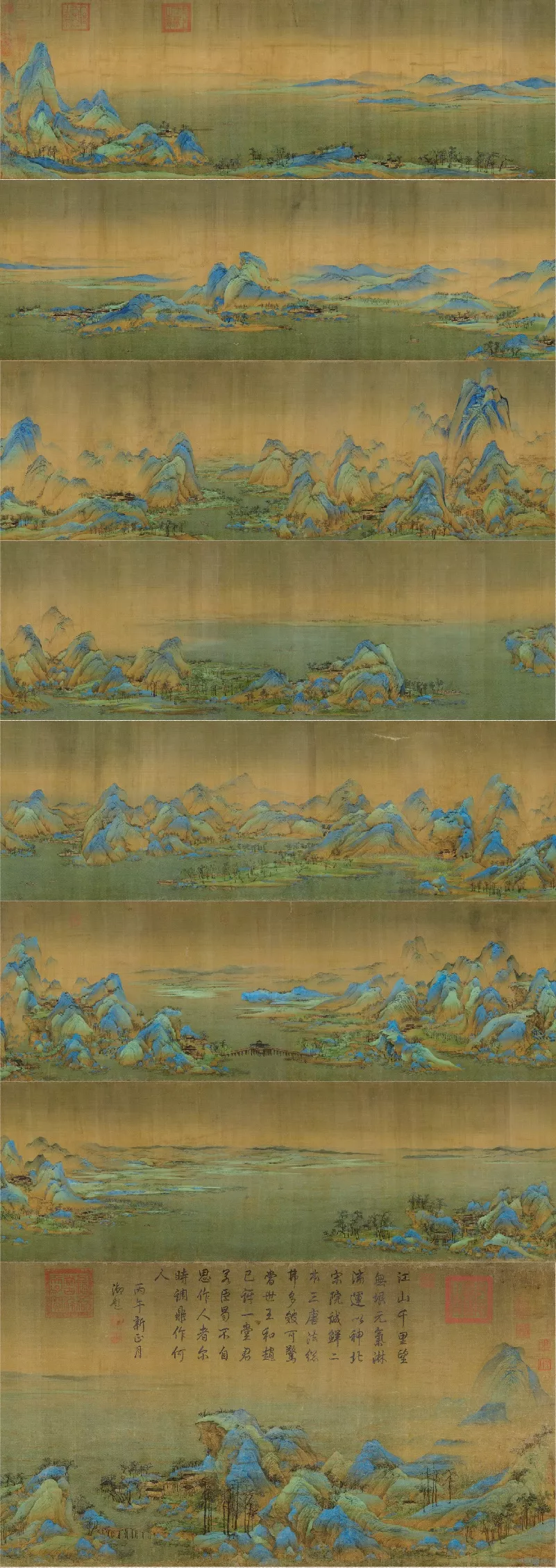 卷后有宋代蔡京、元代李溥光题记,曾经南宋内府、元代李溥光、清代梁清标及乾隆内府收藏,现藏故宫博物院。 《千里江山图》纵51.5厘米,横1191.5厘米,绢本,青绿设色,无款,据卷后蔡京题跋知系王希孟所作,现藏故宫博物院。 作品以长卷形式,描绘了连绵的群山冈峦和浩淼的江河湖水,于山岭、坡岸、水际中布置、点缀亭台楼阁、茅居村舍,水磨长桥及捕鱼、驶船、行旅、飞鸟等,描绘精细,意态生动。景物繁多,气象万千,构图于疏密之中讲求变化,气势连贯,以披麻与斧劈皴相合,表现山石的肌理脉络和明暗变化;设色匀净清丽,于青绿中间以赭色,富有变化和装饰性。作品意境雄浑壮阔,气势恢宏,充分表现了自然山水的秀丽壮美。