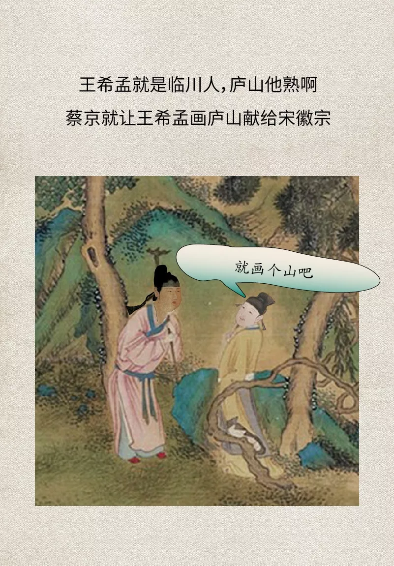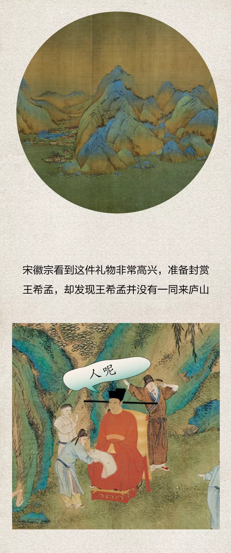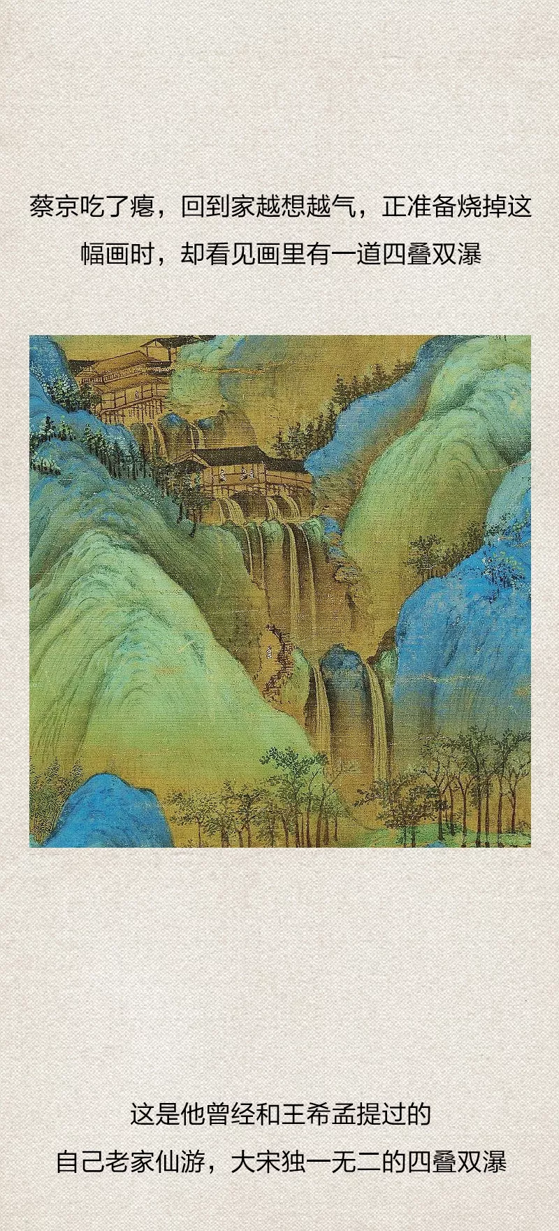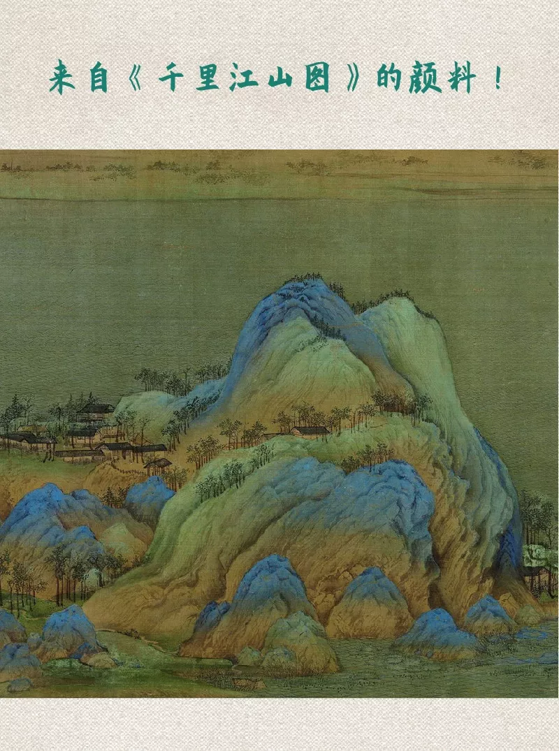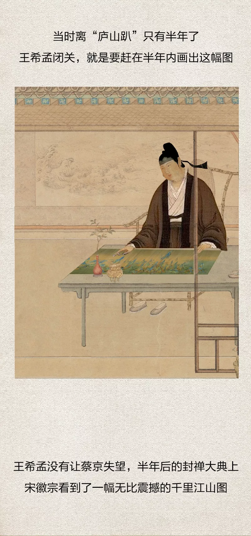 卷,此图赐予蔡京,从其卷后的题跋中得知,此图为绢本,设色,纵51.5厘米,横1191.5厘米,全图以大青绿为基调,山脚、屋墙、水天交接处用深浅各异之赭石色渲染,屋顶用浓黑,人物多粉画,用笔敷彩精细,轻重浓淡生动活脱,灿烂艳灼,美不胜收,千里江山秀丽多姿,雄伟壮观。时人赞其画"一点一画均无败笔,远山近水,山村野市,渔艇客舟,桥梁水车,乃至飞鸟翔空,细若小点,无不出以精心,运以细毫",人物如蚁,不可胜数,生息劳作,生动活泼。