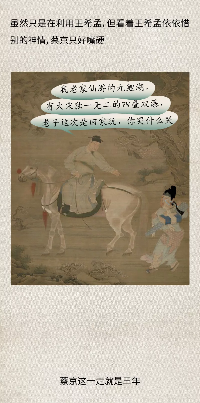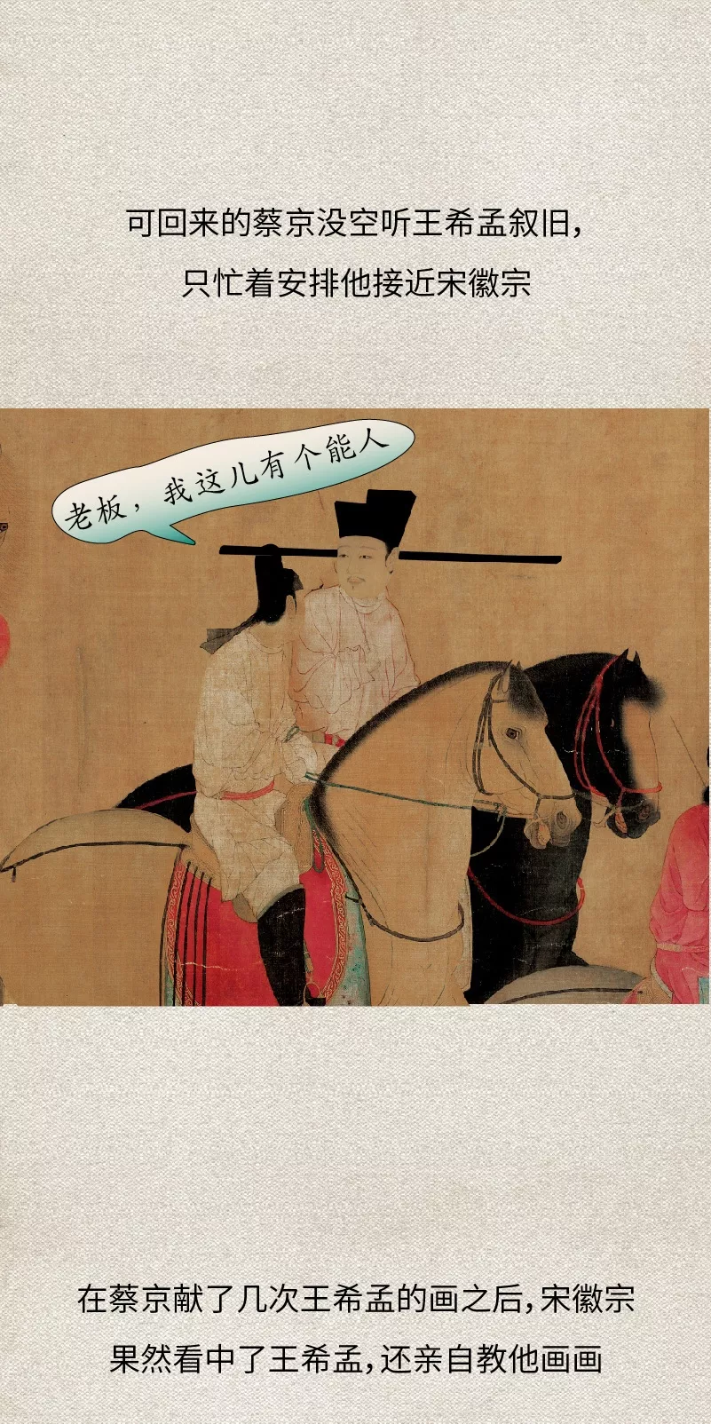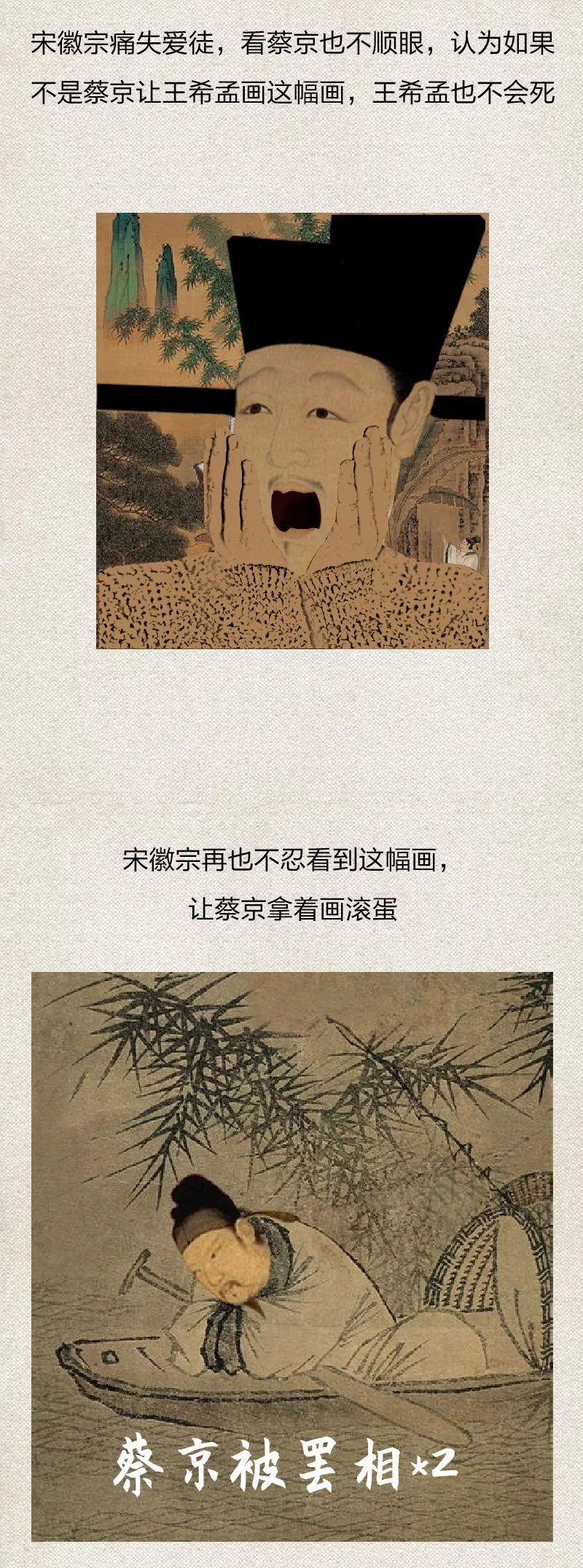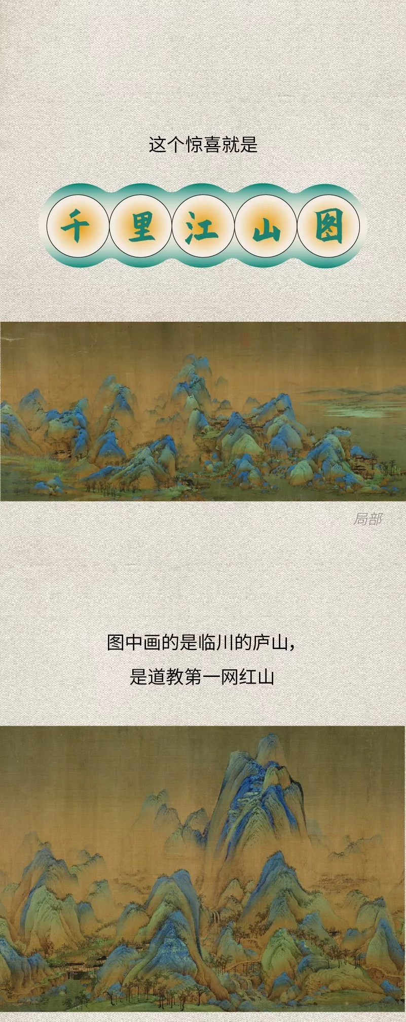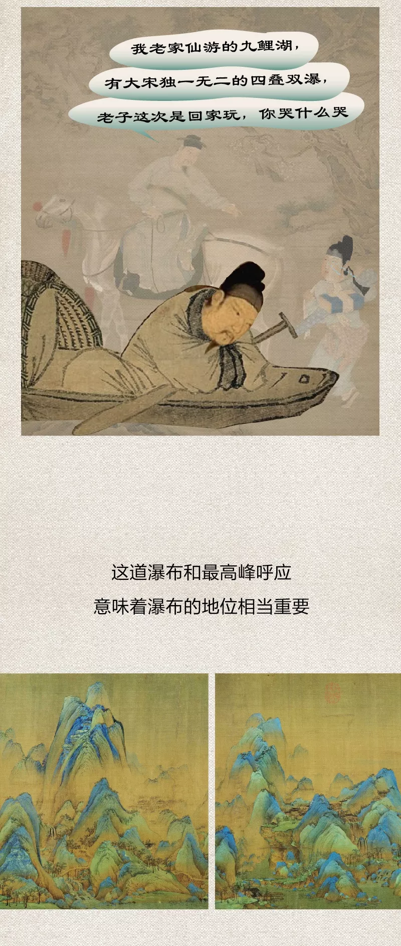 卷,此图赐予蔡京,从其卷后的题跋中得知,此图为绢本,设色,纵51.5厘米,横1191.5厘米,全图以大青绿为基调,山脚、屋墙、水天交接处用深浅各异之赭石色渲染,屋顶用浓黑,人物多粉画,用笔敷彩精细,轻重浓淡生动活脱,灿烂艳灼,美不胜收,千里江山秀丽多姿,雄伟壮观。时人赞其画"一点一画均无败笔,远山近水,山村野市,渔艇客舟,桥梁水车,乃至飞鸟翔空,细若小点,无不出以精心,运以细毫",人物如蚁,不可胜数,生息劳作,生动活泼。