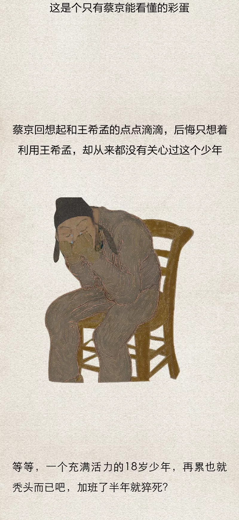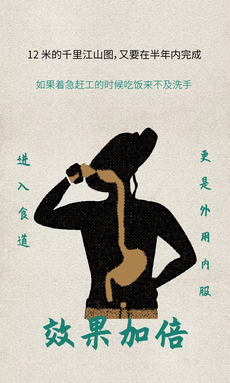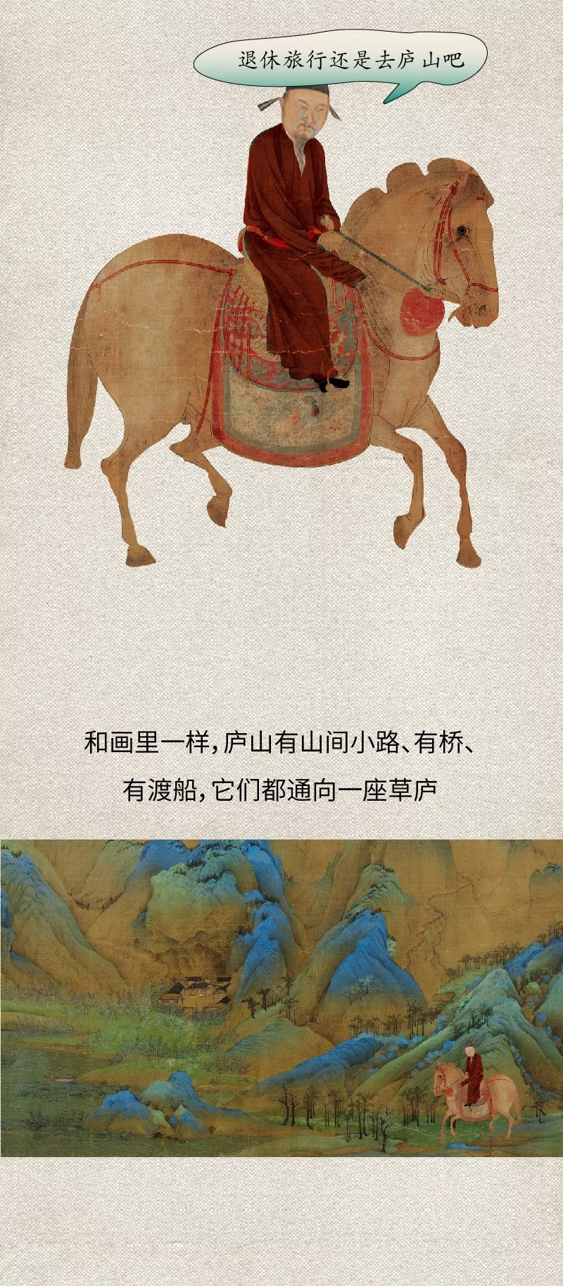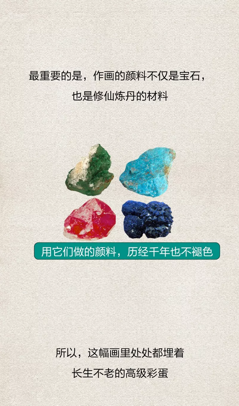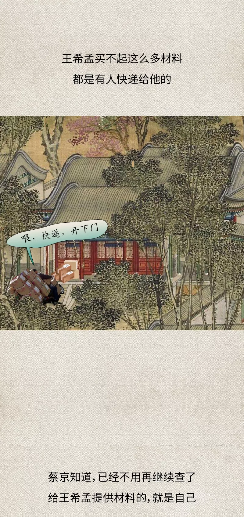 卷,此图赐予蔡京,从其卷后的题跋中得知,此图为绢本,设色,纵51.5厘米,横1191.5厘米,全图以大青绿为基调,山脚、屋墙、水天交接处用深浅各异之赭石色渲染,屋顶用浓黑,人物多粉画,用笔敷彩精细,轻重浓淡生动活脱,灿烂艳灼,美不胜收,千里江山秀丽多姿,雄伟壮观。时人赞其画"一点一画均无败笔,远山近水,山村野市,渔艇客舟,桥梁水车,乃至飞鸟翔空,细若小点,无不出以精心,运以细毫",人物如蚁,不可胜数,生息劳作,生动活泼。