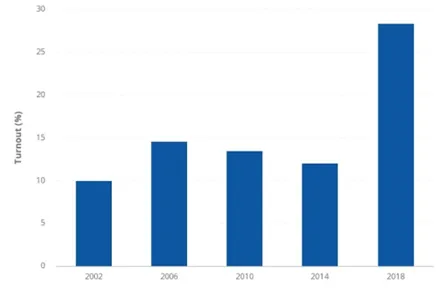 在2014年和2018年的中期选举中,年龄在18-29岁之间的亚裔美国人的投票率增加了19%,而白人为17%,黑人为11%。