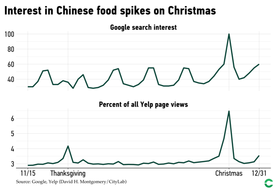 在美国的圣诞节里,也会有一个神奇的景象: 美国的中餐馆里生意会突然出现很多犹太人来照顾生意 。对于他们来说,圣诞节最好吃的并不是烤鸡,而是左宗鸡陈皮鸡等等。 根据调查显示, 过去的几年里,Yelp上中国餐馆的页面浏览量都在12月25日达到峰值,是平常的两倍多。 犹太人是不信仰耶稣的 。尽管基督教就是源于犹太教,都信仰同一个上帝。但犹太教并不承认耶稣是上帝派来尘世的儿子,也不相信耶稣是先知。 而且耶稣还是在 犹太祭司和罗马统治者的共谋 下才被钉死在十字架上的,直到1965年,罗马教廷才正式赦免了犹太人“害死耶稣” 的罪行。