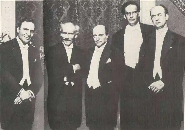 乐迷对这张带有传奇色彩的照片一定不陌生:布鲁诺·瓦尔特、托斯卡尼尼、埃里克·克莱伯、奥托·克伦佩勒、富特文格勒(从左至右)五位指挥大师在意大利驻德大使馆为托斯卡尼尼率纽约爱乐做欧洲巡演召开的欢迎酒会上的合影,1930年