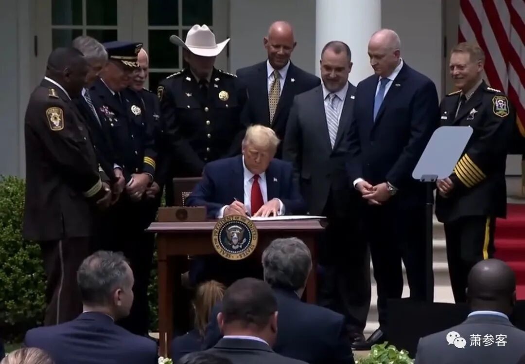 今天有一个行政令需要与你们签署。请提到名的到前面来: 联邦执法委员会、美国警察同业会、国际警察局长协会、国际警察组织国际委员会、美国警察工会委员会、全国警察组织协会,国家地方检察官委员会的认可、全国共享委员会,警长慈善协会等。