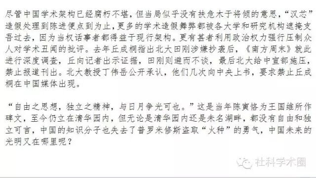 尽管中国在九十年代末提出了“科教兴国”、“建设世界一流大学”的口号,但是目前看来,中国距离这些目标越来越远,因为在现行的专权体制和扭曲的市场机制下,大学没有自由的精神,学者没有独立的思想,反而沉沦堕落,丧失基本的学术道德和伦理,抄袭造假成风。
