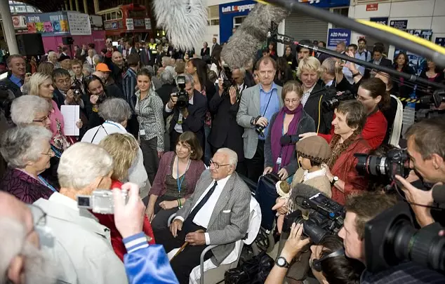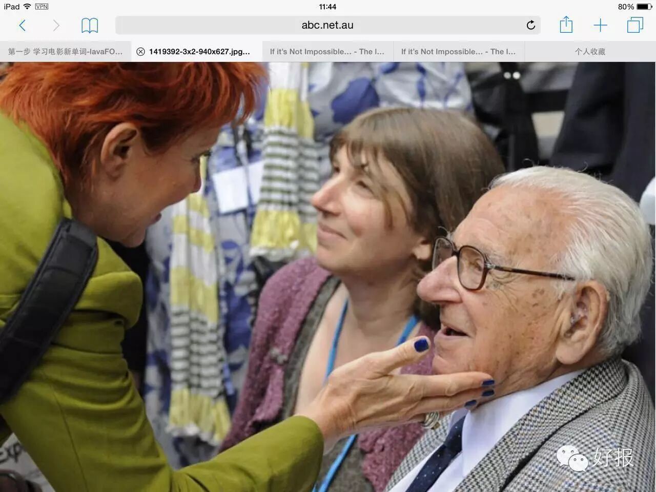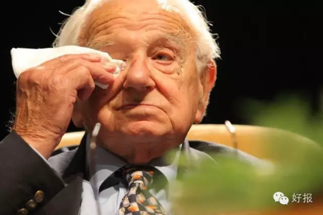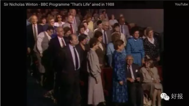 坐在前排的Nicholas Winton怎么也没有想到,身后数排中年人齐刷刷站起来,老英雄也缓缓站起转身,向当年被自己抱上火车的孩子们点头致敬,回过身后,他淡然地,用两根手指透过眼镜片的边缘,擦拭夺眶而出的泪水。