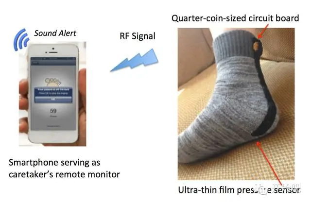 一旦穿着贴有薄膜感应器袜子的爷爷下床, 脚后跟着地, 薄膜感应器就会发送压力值到手机,