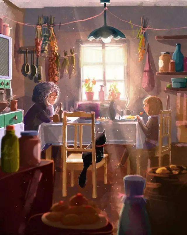 在画中她化解了曾经的伤心、沮丧, 她一次次回到童年 和奶奶在一起的幸福时光。