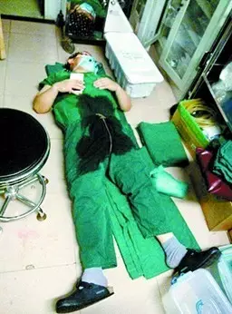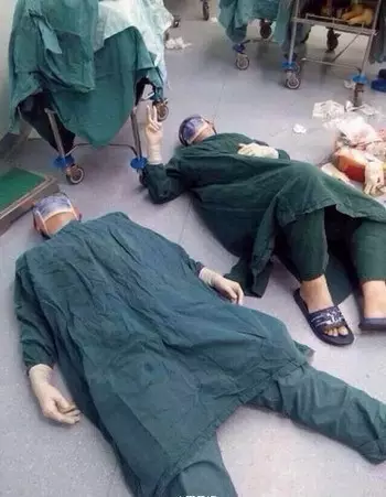 2014年6月,32个小时连续手术后,两名医生累瘫在手术台边