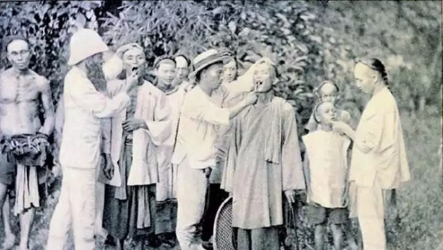 传教士和中国基督徒在为中国平民检查口腔疾病