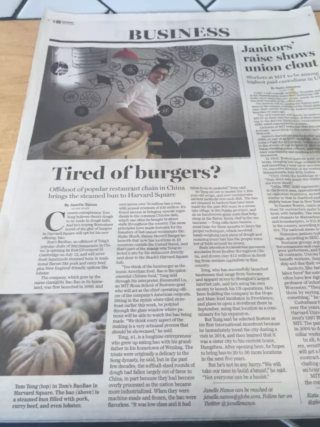 “你认为汉堡是标志性的美国食物,那么包子就是经典的中国传统食物,更是一种跨国文化的交流、沟通。”童启华认为。所以,他敢公开叫板美国汉堡,这也是童启华为什么直接把门店开在哈佛广场 Shake Shack 隔壁的原因之一。