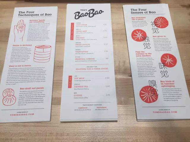 很多老外还不太了解包子,点单台摆放着三份说明,顾客可以按需取阅。一份关于包包的工艺,一份是菜单,一份是包子的四种感觉:视觉、触觉、味觉、嗅觉。