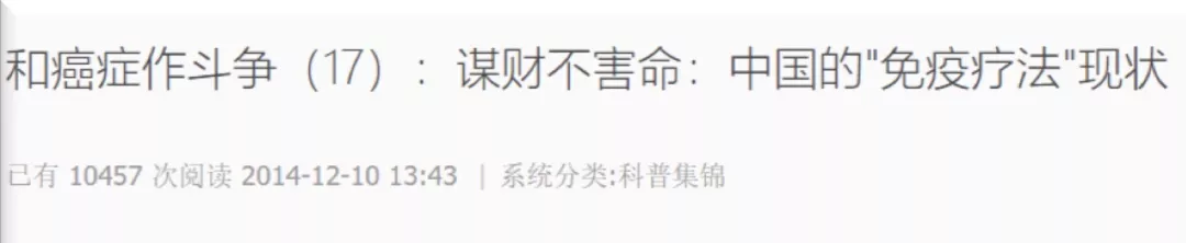 这件事情对很多人来说很愤怒,很痛苦,但对我来说很遗憾。为什么很遗憾,因为在魏则西事件发生一年半以前,我就已经写过科普文章说明他接受的这种疗法是无效的,当时我用的标题是《谋财不害命,中国的免疫疗法现状》。