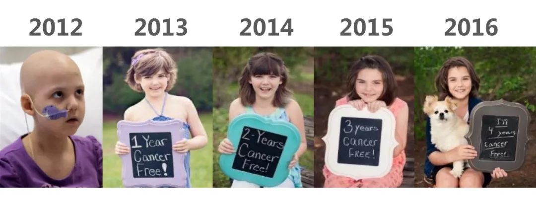 如果能够无限地给病人使用化疗药物的话,我们早就把癌症攻克了,但很多时候还没用到足够多的剂量,病人就受不了了。 靶向药物和免疫药物的副作用通常要比化疗好很多,所以我们希望“去化疗化”。当然现在还不能做到百分之百,但是某些肿瘤类型已经开始出现这样的迹象。 给大家举一个例子。2012年的时候,美国有个小女孩叫Emily,她得了一种非常罕见的儿童白血病,她经历了当时的标准疗法就是化疗。化疗完以后效果不错,于是她就回家了。 但是一年后,她很不幸地成为了那20%、30%会复发的病人,于是她又接受了更大剂量的化疗。没想到过了半年又复发了。 当时两次复发就已经没有标准治疗了,医生直接告诉家长说我推荐你就不要治疗,回家算了,让她最后走得轻松一点。这是没有问题的,我觉得这是非常正确的建议。 但是家长没有放弃,到网上去搜索新的临床实验,于是被他找到了一个新的还没有人用过的疗法,叫CAR-T免疫治疗。这个东西具体是什么我们就不讲了,但大概意思是从病人体内把他自己的免疫细胞拿出来,通过基因改造的办法让它对癌细胞有更强的杀伤力,然后再放回病人体内。 但当时没有人知道这个东西会不会有效,所以Emily成了第一个尝试这种疗法的小孩。最后的结果是令人震惊的。 这是2012年Emily绝望的时候的状态。一年以后她去复查,one year cancer free,就是身体里面已经没有癌细胞了。这是两年、三年、四年、五年的时候,马上她就会拍第六年的照片。