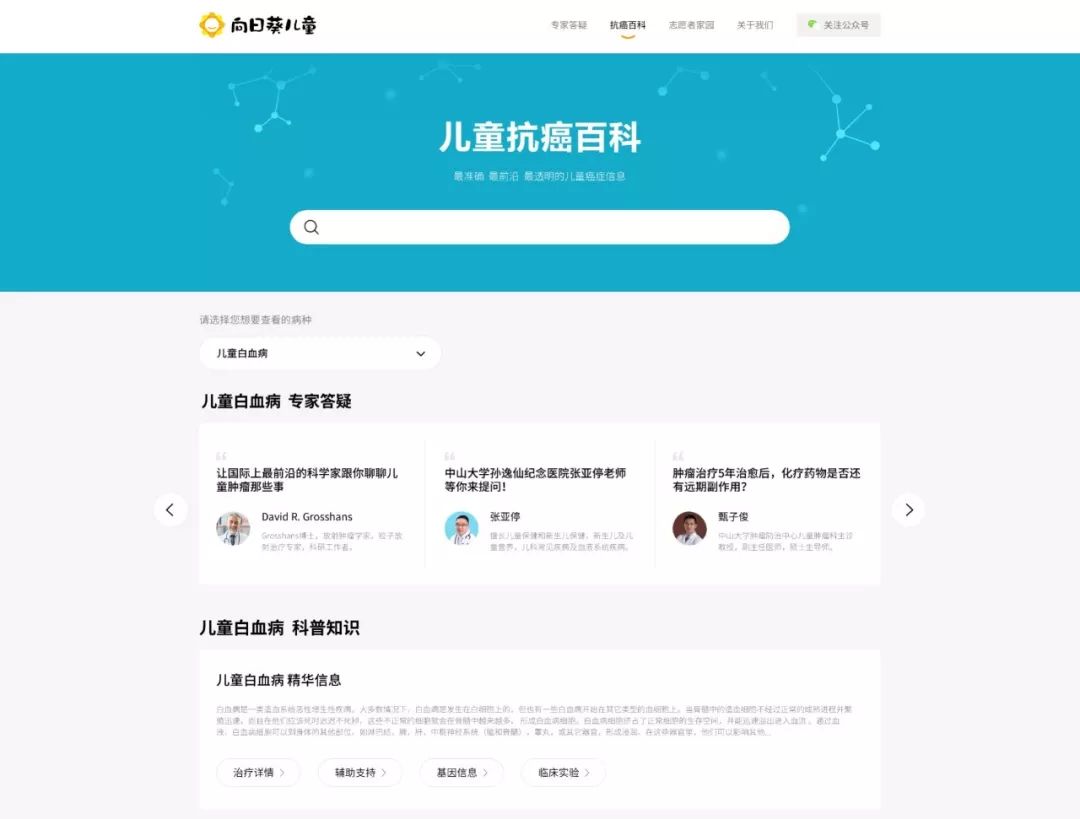 这个成本太高了,这也促使我在大概三年前开始做向日葵儿童,做这个网站的一个根本原因,就是我们想做一个系统性的,中国最好的,最全面的,最权威的,最专业的,最信得过的儿童癌症科普网站。 网站下个月改版后呈现出来的就会是这样,它是一个可以搜索的,可以分门别类查找的一个网站。这个网站最开始做的时候,我们大概动员了一百多个全球各地的,博士级别的志愿者来做这样的事情。