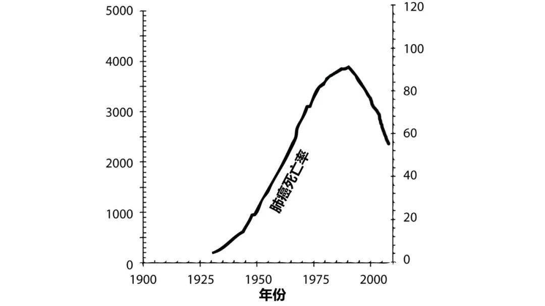 中国的吸烟人口庞大到什么数量呢?就是超过了排在第2位到第30位的29个国家的总和。印度和咱们人口差不多,吸烟人少非常多,肺癌也少非常多。所以别天天去骂PM2.5这些东西,它们需要处理,但不是最最关键的原因,吸烟才是。 很多人都说,你怎么知道吸烟和肺癌关系这么大?我们戒烟到底有没有用?我告诉你有用,不是一拍脑袋瞎说有用,而是美国的经验告诉我们的。 这是美国肺癌死亡率的曲线图,是不是非常奇葩?前面一骑绝尘,从1920年到1970年几乎是直线上升,突然就往下走。
